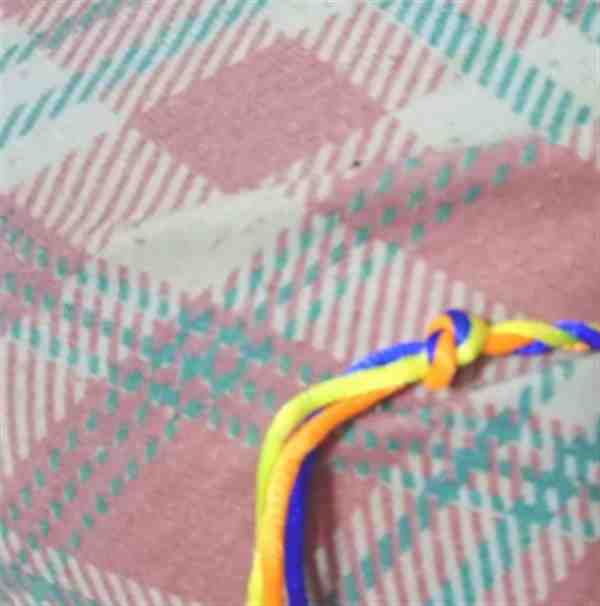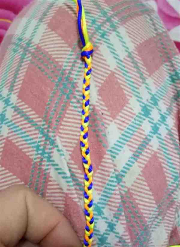 7、在编织到合适的长度后,再次在绳子的末端打一个结,以固定手链的长度。