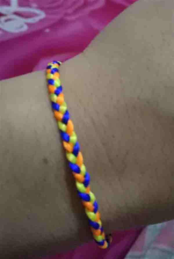 6、重复上述步骤,即蓝色压黄色、桔色压蓝色、黄色再压桔色,循环往复,直到手链的长度达到你的需求。