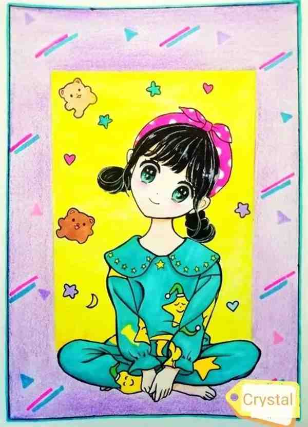 从头部开始上色,用蓝色、浅蓝色画眼球下半部,深蓝、黑色涂色眼球上半部阴影。黑色马克笔涂色头发,高光笔画头发纹路。粉红涂头发发饰,留出白色图案。粉色和肉色彩色铅笔,涂色面部,颜色过渡细腻,尽量避免笔触感。蓝绿色和黄色平涂衣服的颜色。
