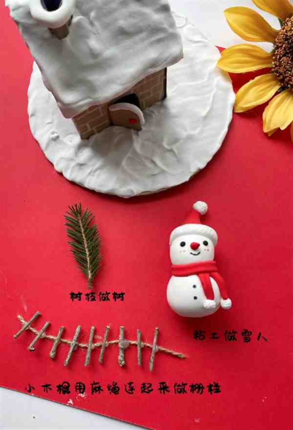 Step 5.树枝做树,粘土做雪人,小木棍用麻绳连起来做栅栏。